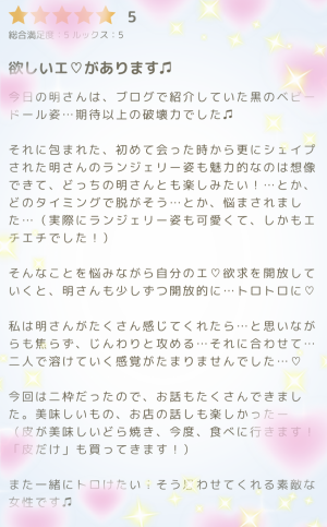 Blog@Academy🐈⬛<口コミお礼💌nakaji様🩷2回目)こんにちは💘明です 本日2回目の更新は 仲良し様の素敵な口コミのお礼です♥️ 先日もありがとうございました💓2回目の口コミも嬉しいです☺️❣️ 元々、愉しい方だな〜という印象でしたが、口コミによりnakaji様の語彙と文才が開花してて、文通のようで楽しみになってます💌 私もお気に入りのベビードール姿🖤お褒めいただけて嬉しいです🌙🐾想像以上に生地やディテールが凝っていて、伸縮性もあるので着たままでも…💗当日は新品のえちえちランジェリーもつけていたので、どうするか迷わせてしまいましたが😂ぜひ、これからは衣装も含めていろんな楽しみ方をしましょう😏❣️ 出前も取っていただきありがとうございます&ご馳走様でした💕誤算があり、駆け足でのお食事時間になってしまいましたが、あれは世界記録の瞬間ですね🙂↕️✨後世に語り継いで行きたいです…! そして、和菓子好きの共通項も知れて嬉しかった〜💘どら焼きの感想も聞かせてくださいね♪ 『欲しいエ♡』ってフレーズ、とっても良いですね💎 欲しがってくれるからエ♡を届けられるし、共にエ♡を作ってくださるおかげでもあります…♥️ また一緒に甘く🍬トロけましょう💫 口コミありがとうございました🍒 "殿方様の日記"といった感じで口コミを読むのとっても楽しいです✨ そんなところ見てくれてたのか〜とかそんなこと考えていたのか〜という発見ができるのも嬉しいんだなぁ☺️💗 明🐾 私の詳細なプロフィールとSNSや姫予約の方法(LINE・メール)などはこちらのページに記載しています♪↓ https://lit.link/38425091 初めまして様、リピーター様どなたでも姫予約可能です💗出勤リクエストや1ヶ月前からご予約を抑えられるなどのメリットがございますのでぜひご活用くださいませ✨ 🆕LINEが新しくなりました❣️ LINE:@904qfyli mail:yuriliy.um@gmail.com Twitter:@ofuroniiru Instagram:@ac_akirakira 10月ご予約フォームブログ一覧