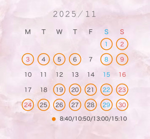 Blog@Kohaku❀11,12月のスケジュール❀初めましてさま・仲良しさまともにLINE or メールからの直接のお約束が一番うれしいです🍒下記(1)-(3)の全項目をご記載の上お問い合わせください♩ ⋆┈┈┈┈┈┈┈┈┈┈┈┈┈┈┈┈┈⋆ 🌸公式LINE:@196gkjnk🌸Mail:midori23725@gmail.com (1)お名前:(2)お電話番号:(3)ご希望の日時:◯月◯日 8:40/10:50/13:00/15:10 ⋆┈┈┈┈┈┈┈┈┈┈┈┈┈┈┈┈┈⋆ ⚠️必要事項(1)-(3)のご記載がない初めましてさまからのご連絡にはお返事ができません💦 また、LINEやメールへのお返事はお約束に関するものだけとさせていただいております🥲 ⚠️お部屋が混み合っているためお早めにご連絡をいただけるとご希望のお時間にご案内しやすくなります🕰️ ⚠️当日のお約束については琥珀まで直接お問い合わせください📞 ⋆┈┈┈┈┈┈┈┈┈┈┈┈┈┈┈┈┈⋆ 来月もすてきなご縁を結びあえますように🎀 それでは♡ お会いできるあなたさま、思い出してくださっているあなたさま、まだ見ぬあなたさまにとっても健やかなる霜月となることを願って💐⊹゚ ❀ お問い合わせはこちら ❀ブログ一覧