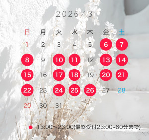 3月の予定(改訂版𓂃🫧)こんにちは! あおいです🤍 3月の予定を少しだけ調節できまして 出勤を増やすことができました! 3/17(火曜日) 13:00~23:00 3/18(水曜日) 13:00~23:00 追加しましたので ぜひお会いできたら嬉しいです🤍 いつも会いに来てくださるお兄様がいて下さるおかげで、毎月の目標も少し高めに設定していきたいなぁとか、前向きな気持ちで頑張れています! これからも、お兄様に会いたいと思い続けていただけるような素敵なキャストを目指して頑張ります🫧✨ 今月は、24日(火曜日)と26日(木曜日) 2日間出勤いたします! 今月も楽しい時間を沢山ありがとうございました! 残り2日間も楽しみにしております🤍 姫予約のテンプレート 🌹時間割:13:00/14:45/16:30/18:15/20:00/21:45 (上記あくまで目安時間です🤍) ━━━━━━━━━━━━━━━━━━━━━①お名前同一同名の方がいますので下の名前もお願いします。②ご希望日⚪︎第一希望 月 日 時⚪︎第二希望 月 日 時⚪︎第三希望 月 日 時※候補日時が多ければ多いほどスムーズに御予約を承れる可能性が高いです。③コース時間90分/120分/150分等ございます④送迎の有無日暮里駅もしくは入谷駅の2箇所より送迎車が参ります。⑤お電話番号⑥お会いしたことがあるか否か。または、伝えたいことがありましたらお書きになってくださいませ🤍━━━━━━━━━━━━━━━━━━━━━以上6点をご記入の上ご連絡ください🌹 コピーしてお使いくださいませ 連絡先はこちら💌 Gmail exellentroom.rei.aoi@gmail.com LINE 正直未経験の私が入店半年で ここまで頑張りたいと思えたことが 奇跡のようなものですし こんな私の元に毎月会いに来て下さるお兄様や いつも会いに来てくださるとお兄様がいて下さり 日々感謝の気持ちでいっぱいです! いつも本当にありがとう〜🤍 これからもよろしくお願いいたします! あおいブログ一覧