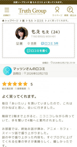 口コミどうもありがとうございます❣️ よく笑うもえです⤴ すぐ口コミ投稿してくれて、感激です°・*:.。.☆ あいたい気づいて逢いにきてくださり ありがとうございました⭐ いろいろ楽しい話題も提供してくださり✨ 沢山笑ってしまいましたo( ^_^ )o ぜひまた、お待ちしています︎💕︎ プレイも褒めてくださり、 ありがとうございます💋 もえ💌♡