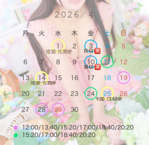 4月スケジュール🗓️💫4月のスケジュールになります! いちお5月もできてるのですが 一旦こっちだけ🥹🎶 姫予約👸🏻♡ 早めのご予約ができるので確実です◎ 野球開幕〜ってことでユニフォームにします🐹 たのしみだな〜〜〜 *ご予約について* 電話予約 → 前日16:00- / 当日8:00-ネット予約 → なし姫予約 → いつからでも2日前までOK ◎指名料はかからないのでご新規様も本指名様も事前に予定を決めたい方は姫予約が1番おすすめになります! ◎基本予約時間(90.120.それ以上可)12:00 / 13:40 / 15:20 / 17:00 / 18:40 /20:20 💌メールmikuru.kan2@gmail.com🐣X (凍結中)@mikuru_neoneo🟢LINEは直接会った方のみ 未来ブログ一覧
